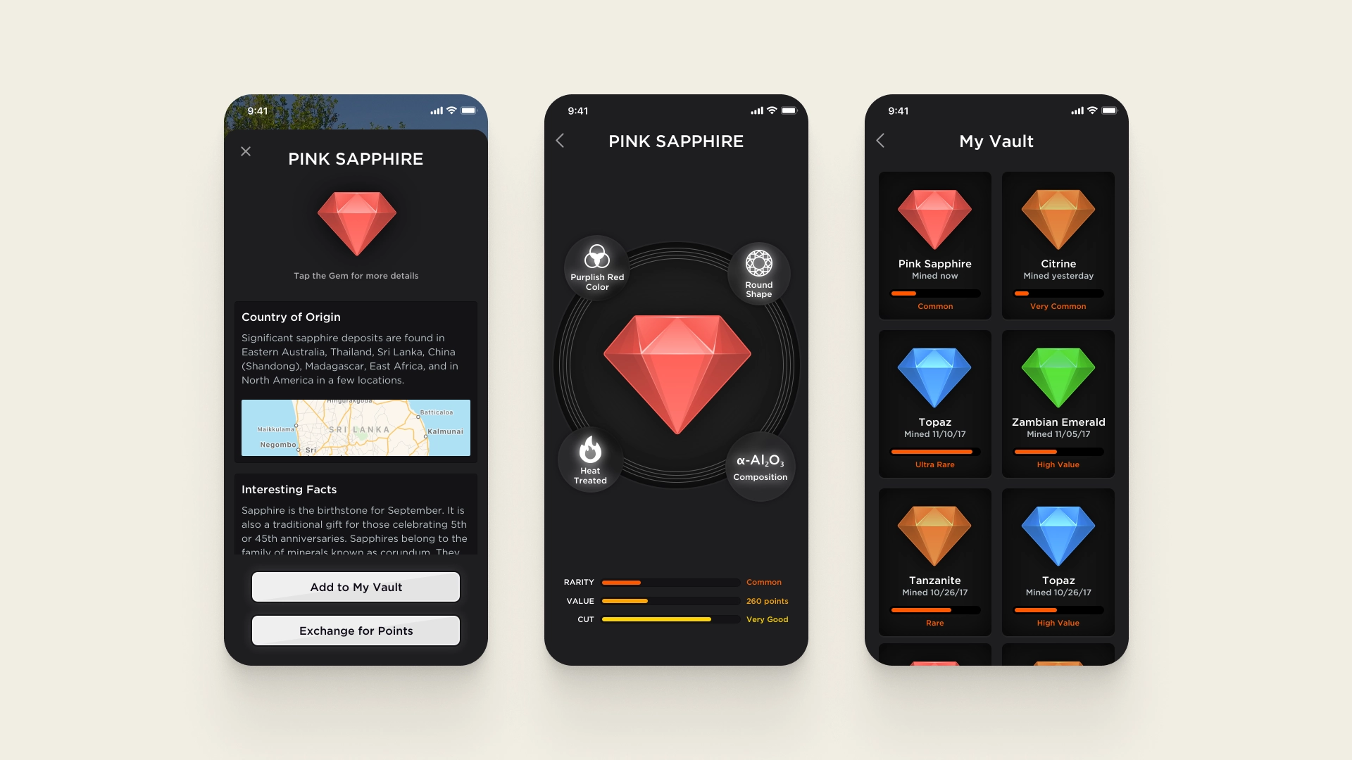 We designed an AR game that encouraged users to step outside and "mine" for virtual gemstones in real-world locations. A small, animated robot companion guided the experience, helping users scan their surroundings, extract stones, and learn about their discoveries. Each gemstone came with its own collectible card - complete with stats, background, and rarity details - making the experience feel part educational, part game. Players could mine, collect, gift, or even purchase new stones to build out their personal vaults.