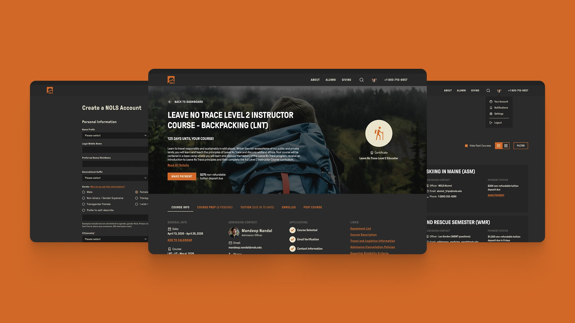 The end result was a cleaner, more visually refined dashboard with unnecessary clutter removed. Secondary information was moved into the standard user dropdown, allowing the interface to focus clearly on courses. Compared to the previous experience, there is now a clear distinction between courses a user is enrolled in and those they manage on behalf of others.Each course’s detailed page exposes all essential information upfront, with payment options accessible in a single click. To further enhance the experience, we introduced a dark mode which aligns naturally with NOLS’ brand colors and was the preferred option among the project team.