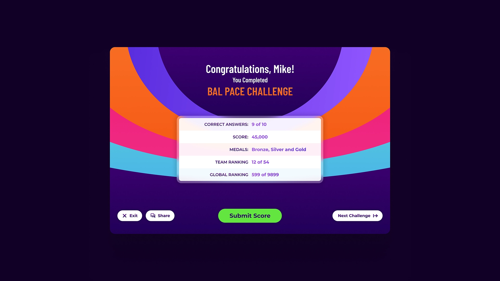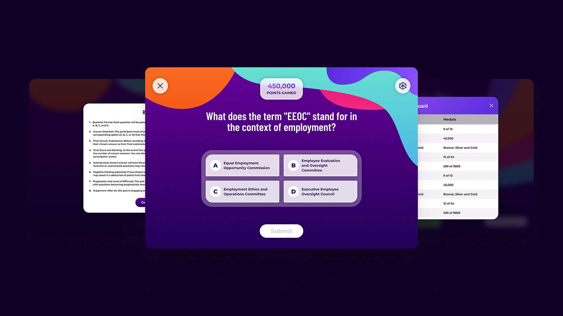 The game combines fun and challenging Millionaire-style gaming experience with educational and team-building content. It enables participants to challenge each other by sharing their scores or viewing global scoreboards.