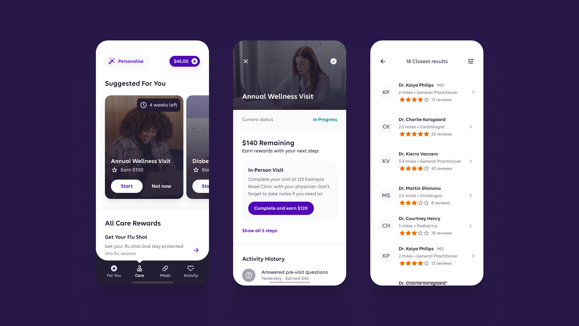 The end result was a simple onboarding experience, followed by easy to follow weekly goals, set up by the user. Members could track medication and get support when they slip on their adherence. Along with step tracking and booking annual wellness visits, which also reward members. In each case users are given step by step guidance on how to work towards their goals. Our process with development went smoothly with detailed design QA, incredible developer ownership and a truly collaborative atmosphere.